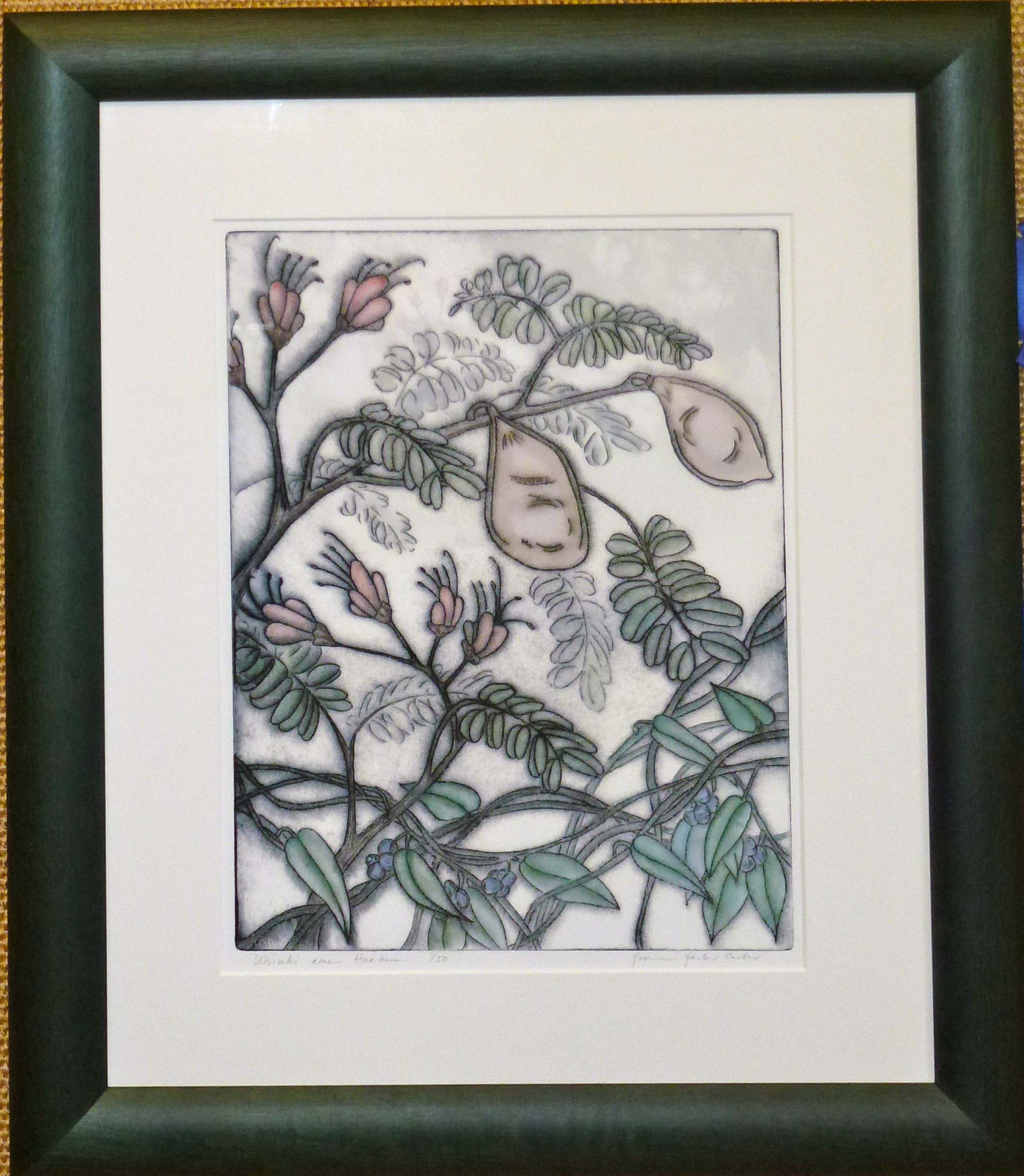 1st Place – “Uhiuhi ame Huehue”, Yvonne Yarber Carter (drypoint and watercolor)