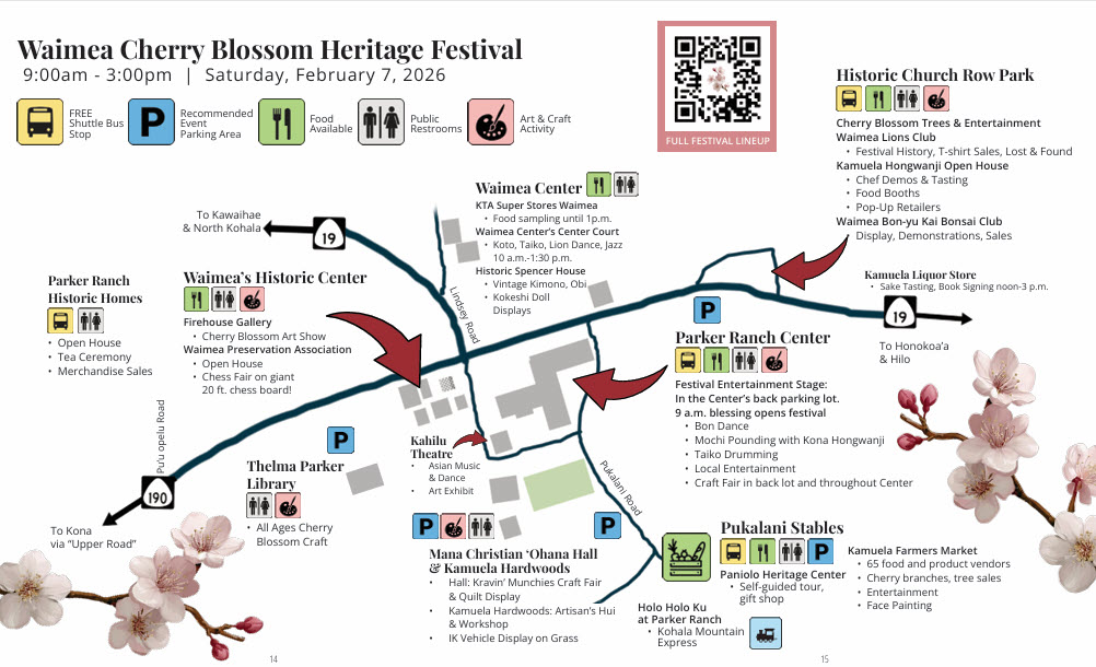 Souvenir Program: (Download a full PDF version with map here) for a comprehensive overview of the festival, including features on Waimea’s cherry blossom history, the many community organizations and businesses contributing to festivities, cultural insights, and highlights of this year’s event.