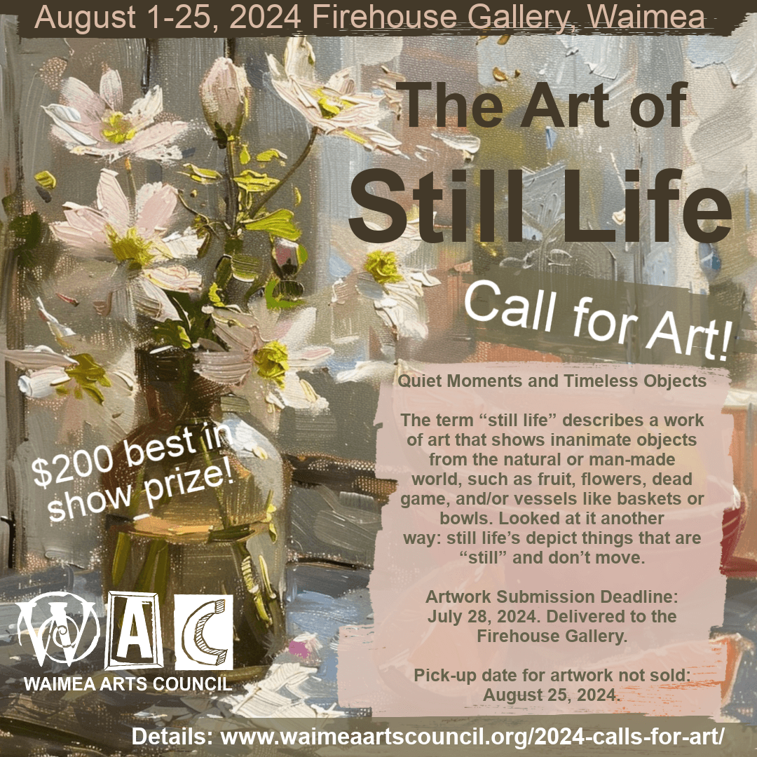 The Waimea Arts Council is pleased to invite island artists to participate in The Art of Still Life. The term “still life” describes a work of art that shows inanimate objects from the natural or man-made world, such as fruit, flowers, dead game, and/or vessels like baskets or bowls. Looked at it another way: still life art depicts things that are “still” and don’t move.