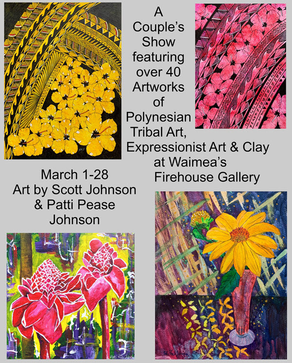“A Couple’s Show” will run from March 1-28. The Firehouse Gallery is open Thurs.-Sun. from 11–3 and whenever the flags are flying. Call 808-887-1052 to confirm.