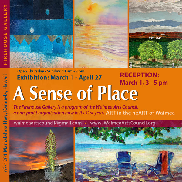 The Waimea Arts Council is honored to present A Sense Of Place, an vibrant exhibit focusing on the unique and vibrant scenery on our island. Explore how our local artists have interpreted our home through various media, from volcanic mountain slopes and lush rainforests mauka to golden beaches and rocky shores makai. The show runs from March 1 through April 27.