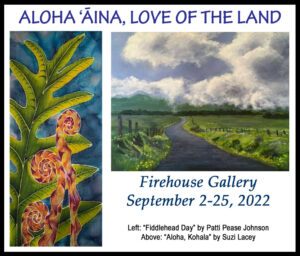 Waimea Arts Council and Firehouse Gallery invite you attend the Aloha ʻĀina, Love of the Land Exhibition to run in conjunction with the 2022 Aloha Festival, September 2 – 25, 2022. Reception will be Saturday, September 10 from 12-3.