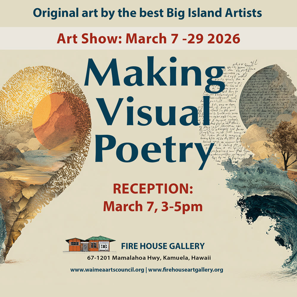 An exhibit of oil paintings by Norma Watt - March 2026 Artist Statement: I have lived in the Islands since the 60’s and I want my paintings to recapture some of the past and preserve scenes of the present. The Firehouse Gallery is located at the intersection of highways 190 and 19 and is open from Thursday – Sunday 11-3 and whenever flags are flying. For more information, call 808-887-1052.