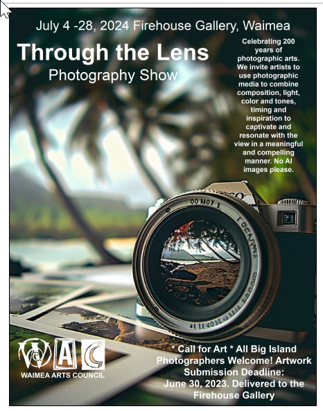 The Waimea Arts Council is pleased to invite island artists to participate in Through the Lens, a show that celebrates 200 years of photographic arts. We invite island artists to use photographic media to combine composition, light, color and tones, timing and inspiration to captivate and resonate with the viewer in a meaningful and compelling manner.