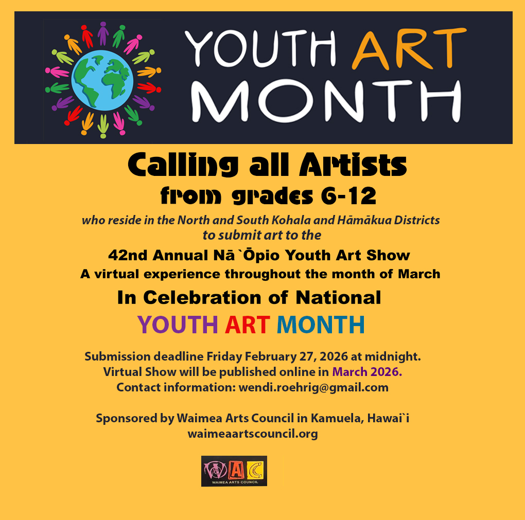 Calling all Artists from grades 6-12who reside in the North and South Kohalaand Hāmākua Districtsto submit art to the 42nd Annual Nā`Ōpio Youth Art ShowA virtual experience throughout the month of March 2026 In Celebration of National YOUTH ART MOUNTH Submission Deadline: Friday, February 27, … [Read more...] about Calling all Youth Artists – Submission Deadline: Friday, February 27, 2026