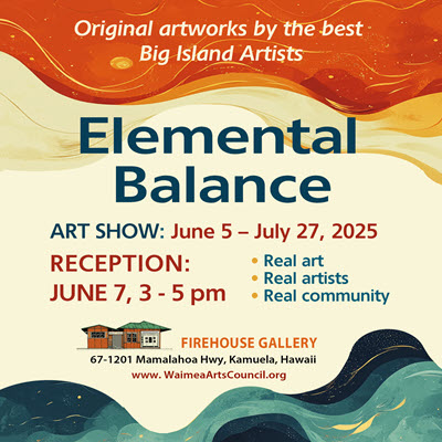 The Waimea Arts Council is excited to host "Elemental Balance," a group exhibition by our members, exploring the fundamental forces of nature that shape our world and our lives. Please join us at the opening reception on June 7 from 3:00 to 5:00 pm. The show continues through July 27. Art … [Read more...] about Elemental Balance Art Show – June 5 to July 27, 2025