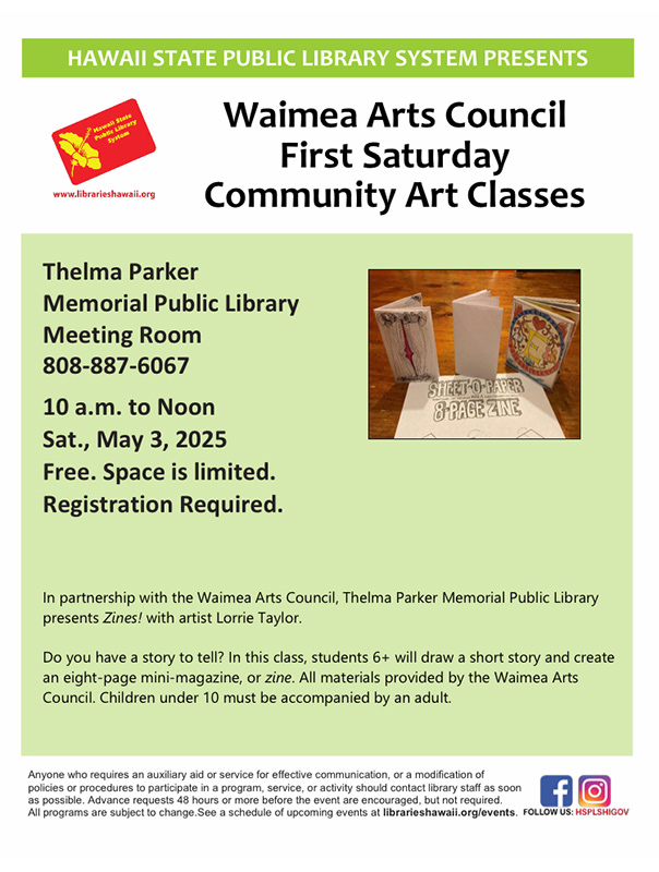 Do you have a story to tell? Join us at Zines! a community art class hosted jointly by the Waimea Arts Council and Thelma Parker Memorial Public Library. In this class young artists 6+ will draw a short story and create an eight page mini-magazine or zine. All materials will be provided by the … [Read more...] about Free Community Art Class “Zines!” on May 3