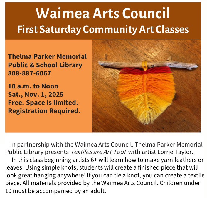 The Waimea Arts Council and Thelma Parker Memorial Public Library are offering a community art class on November 1 called Textiles are Art Too! Artist Lorrie Taylor hosts the session on Saturday November 1 from 10 am - noon in the Thelma Parker Memorial public library meeting room. In this class … [Read more...] about Free November 1 Art Class on Textiles