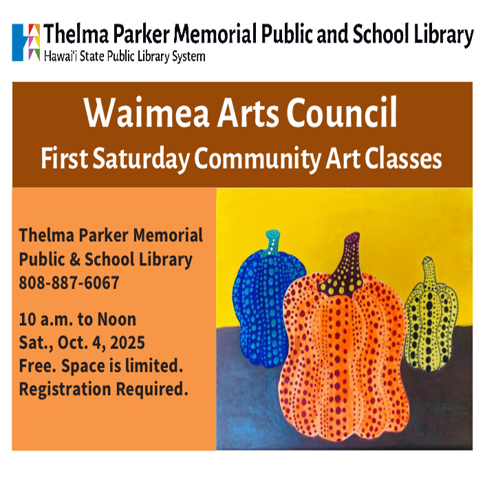 In this class beginning artists 6+ will learn about living artist Yaylor Kusama. The Waimea Arts Council and Thelma Parker Memorial Public Library are offering a community art class on Polka Dot Painting. Artist Lorrie Taylor hosts the next session on Saturday, October 4 from 10 am – noon in the … [Read more...] about Polka Dot Painting: Saturday, Oct. 4, 2025