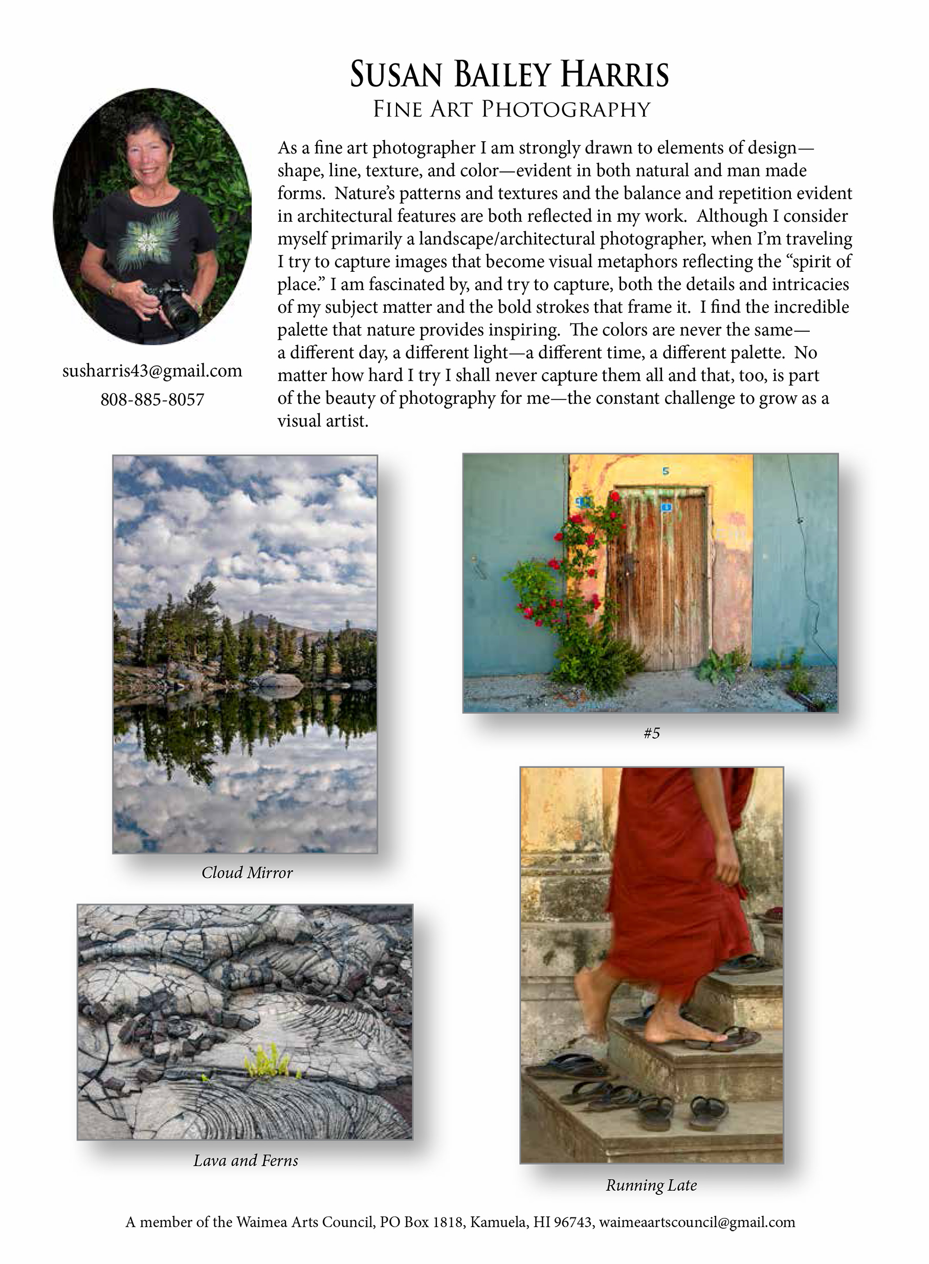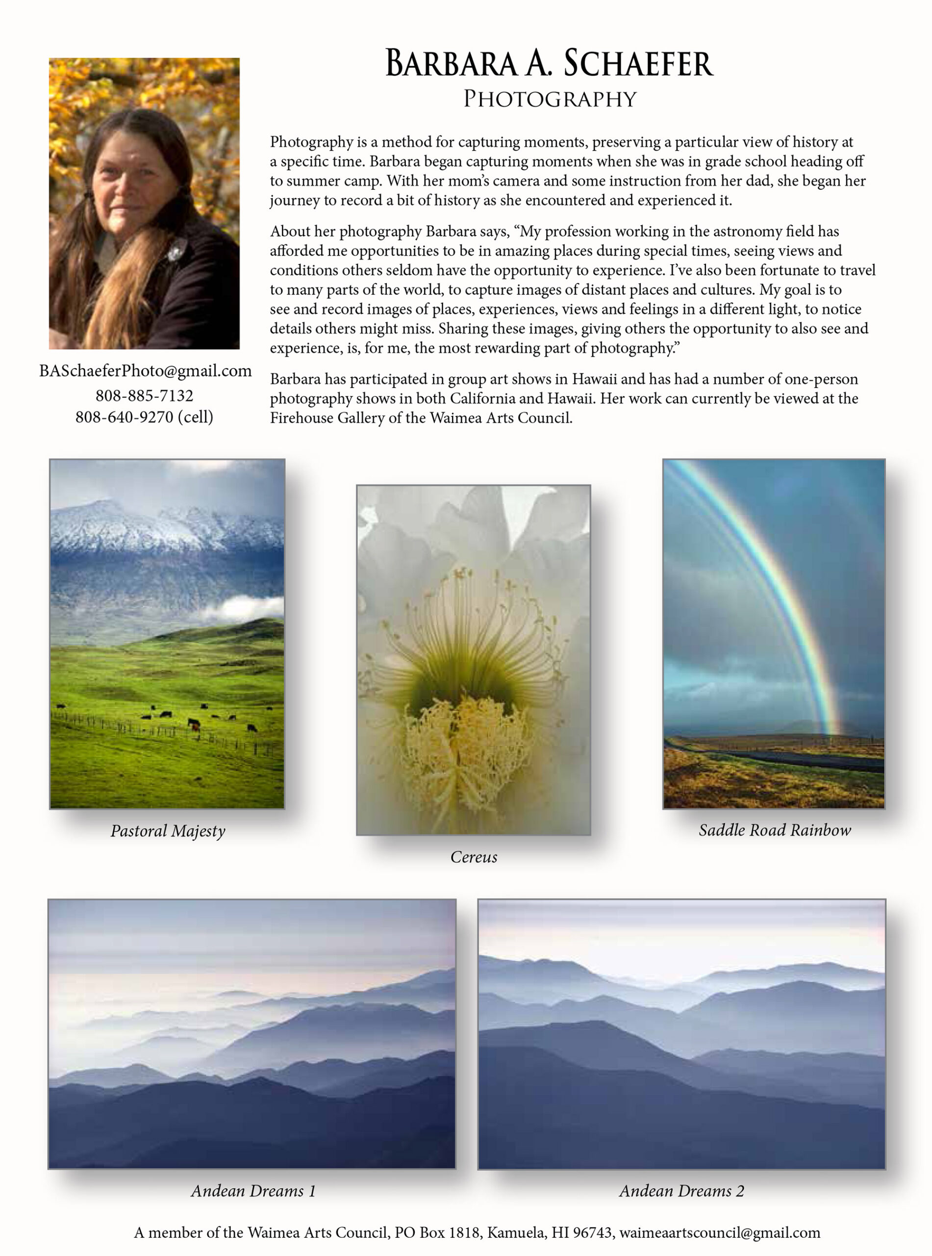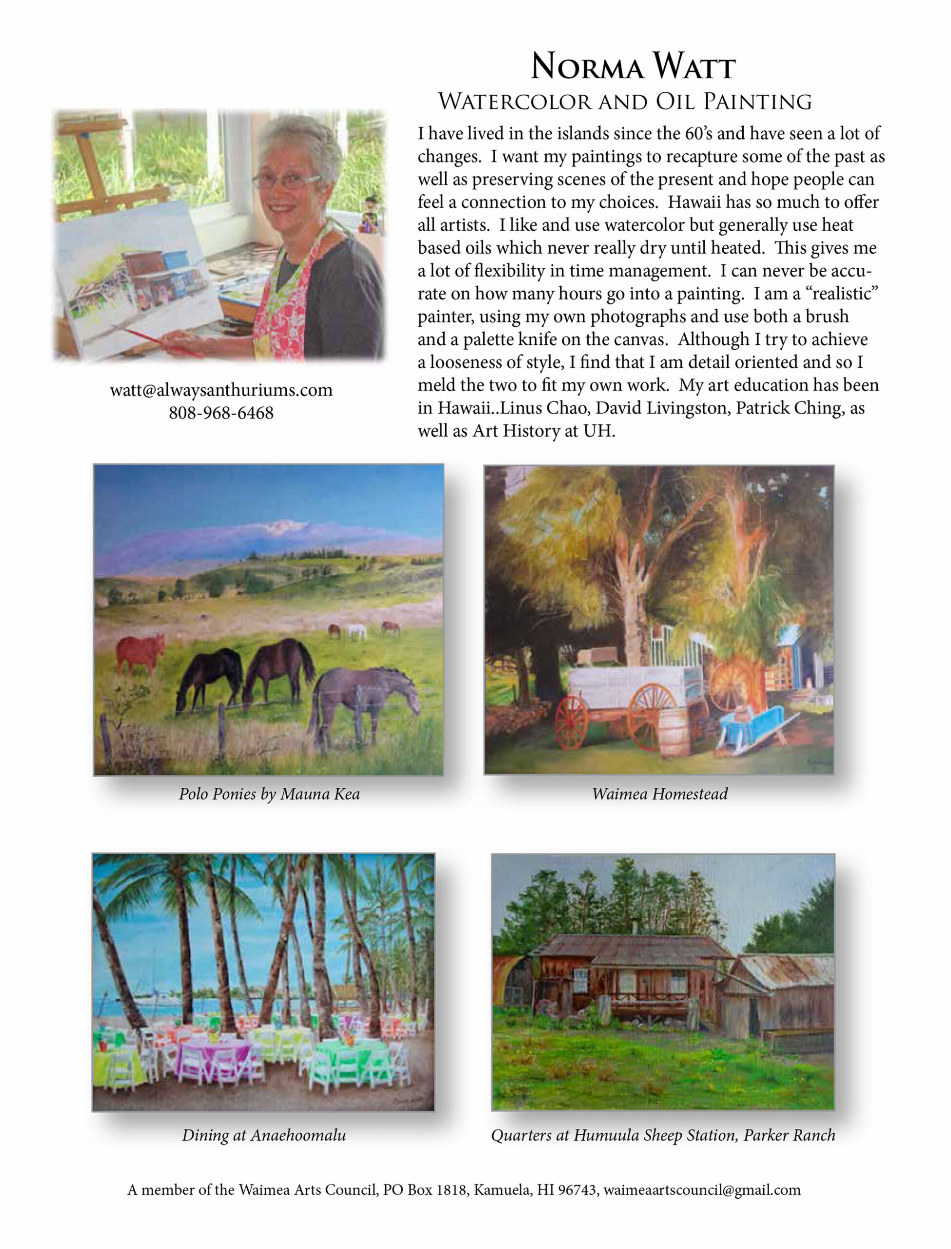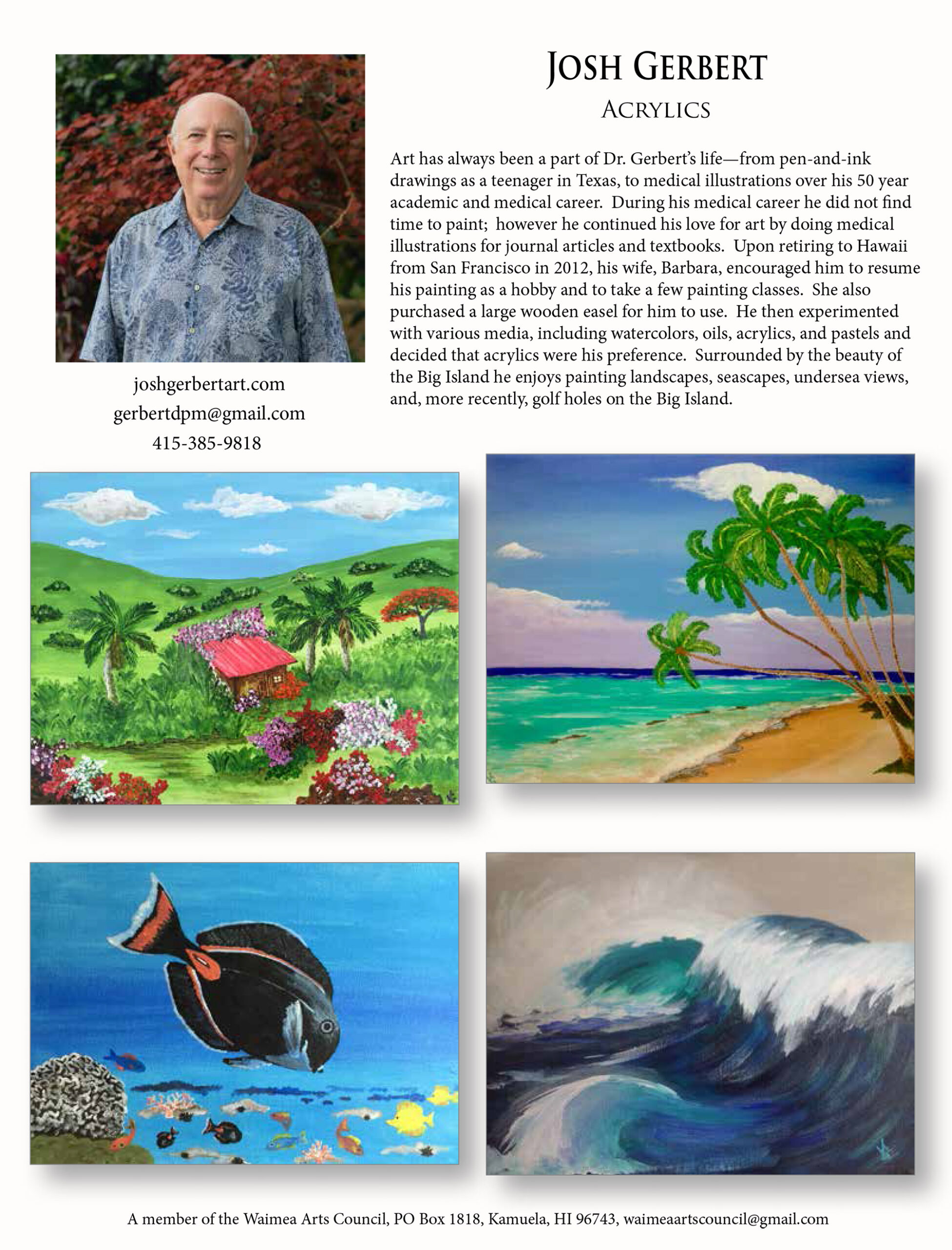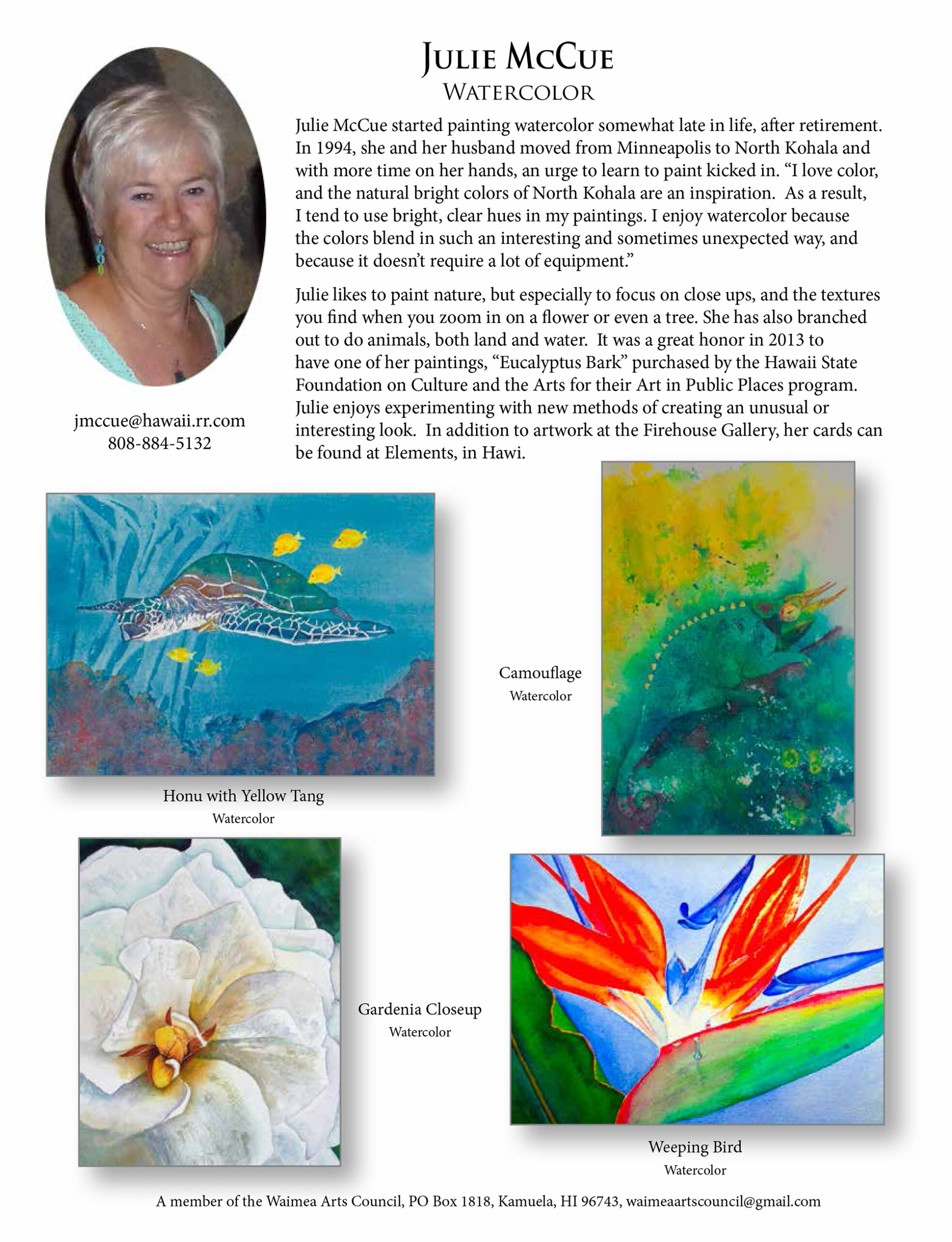 The Waimea Arts Council has a number of talented, local artists that exhibit and have their works for sale in our Firehouse Gallery. Click on the artist’s bio link to find out more about each individual artist and see a few examples of their work.