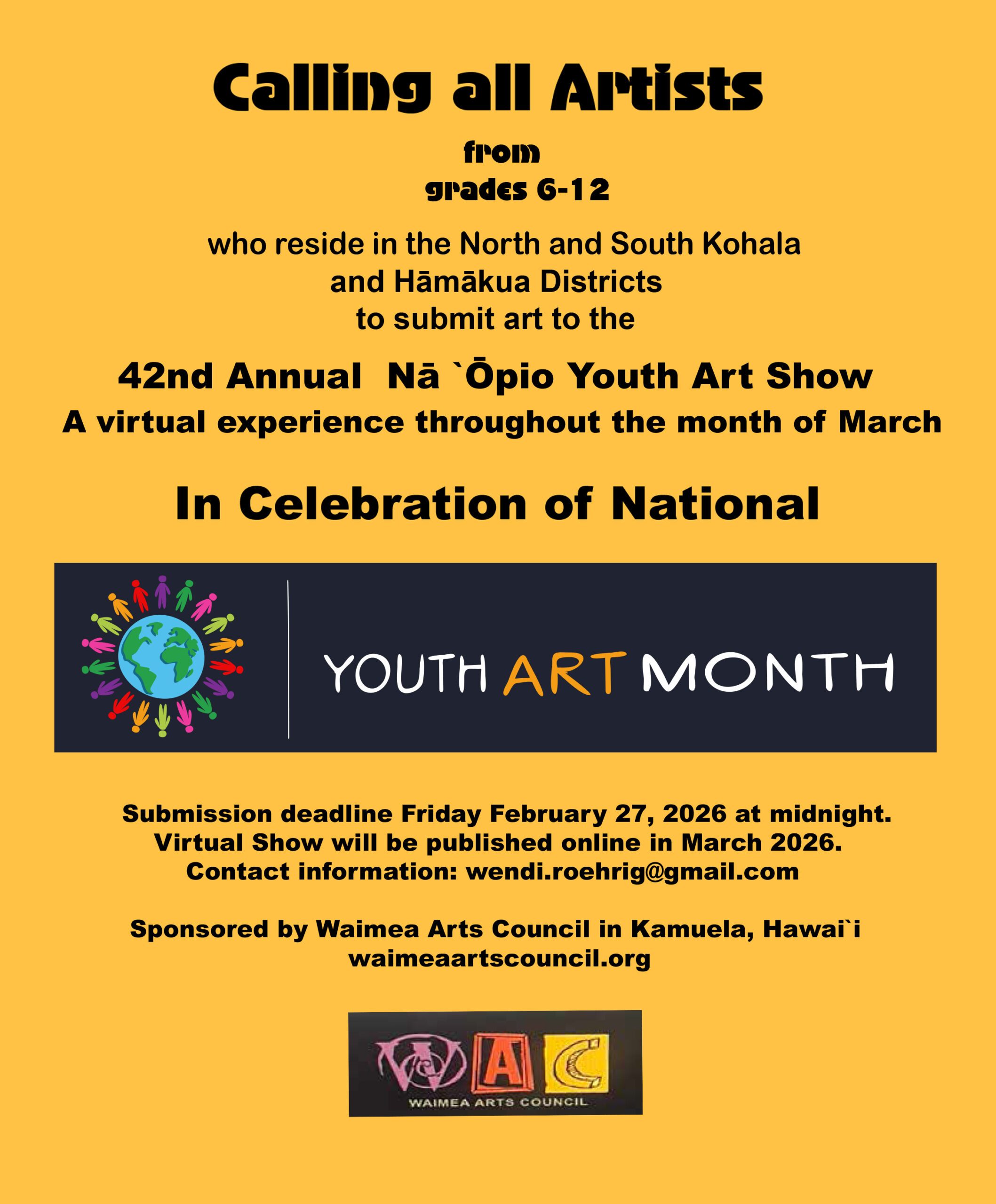 The Waimea Arts Council celebrates National Youth Art Month with the 41st Annual Nā `Ōpio (Youth) Art Show. Young artists in grades 6 through 12 from schools and homeschooled students in the North and South Kohala and Hāmākua districts have been invited to show their original works of art in this year’s show.
