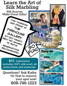 Reservations are recommended but drop-ins are also welcome. Contact Kathy Sprinkle via email at Kathy@ASilkExperience.com or by calling 808-746-1223 to reserve your spot or for more information. Kama’aina ask how to save $5 off your silk experience.