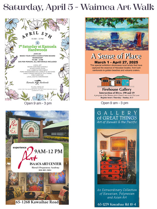 The Firehouse Gallery is proud to be a stop on the Waimea Art Walk on April 5 . We are one of four non-profit galleries are included in this month’s event. Come see the works of local artists of upcountry Hawai’i island.